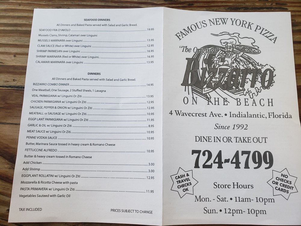 Discover the authentic taste of New York at The Original Bizzarro Famous New York Pizza, located at 4 Wave Crest Ave in Indialantic, FL. This pizzeria is your go-to spot for a genuine NYC pizza experience, celebrated for its crisp, thin crust and generously sized slices that are sure to delight. Customers rave about the house pie, perfect for those craving a slice bigger than their plate.
